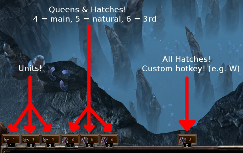 Finding a way to hotkey your queens to suit your style is very important and every hatchery should always have a queen paired to it for larva inject. There are a number of ways to hotkey queens, my current way is to hotkey each queen to a separate hatchery, then double tap the hotkey to focus on the hatchery and inject easily.