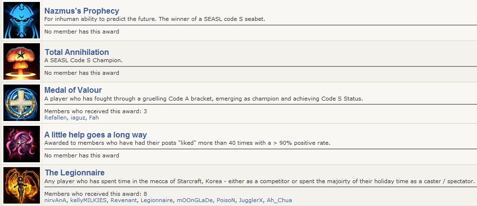 Check out all the badges we have here - who the awards have been given to and how to win such awards! http://www.sc2sea.com/awards.php
